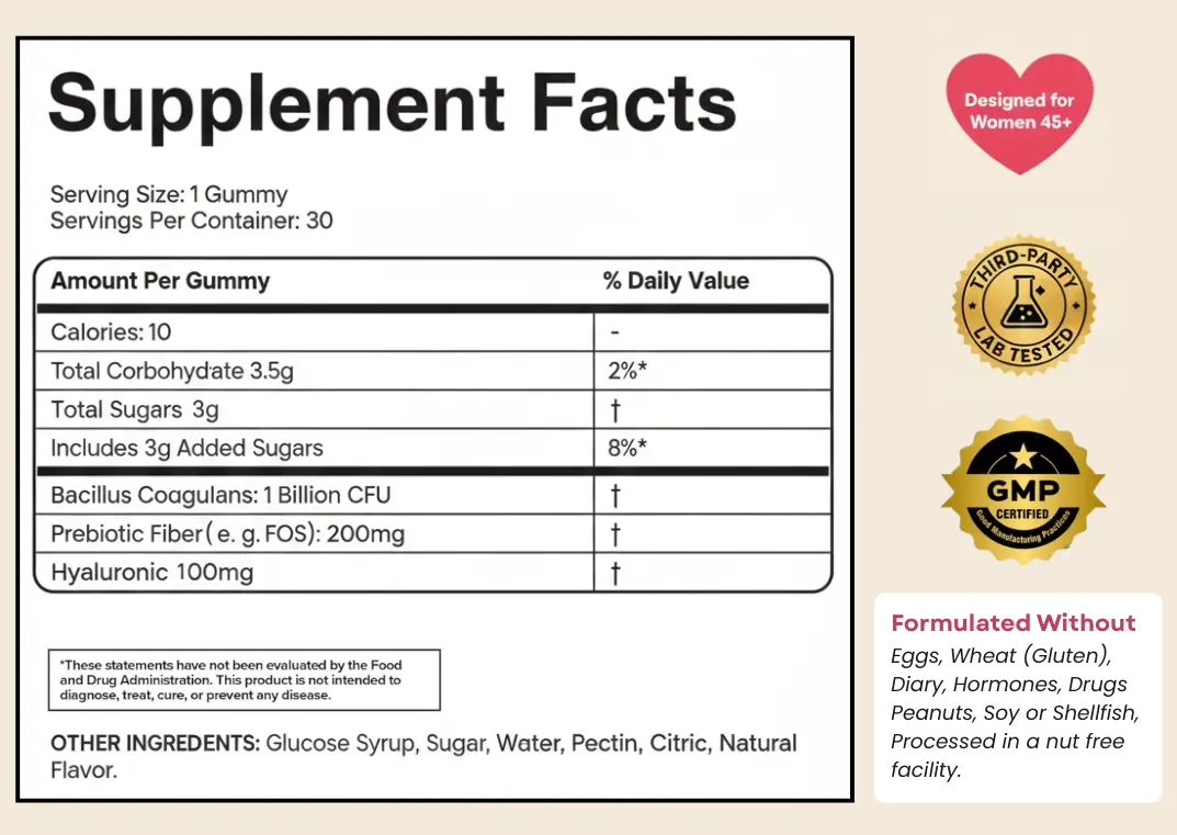 Bacillus Coagulans (1 Billion CFU) – Clinically studied probiotic strain for microbiome balance.
