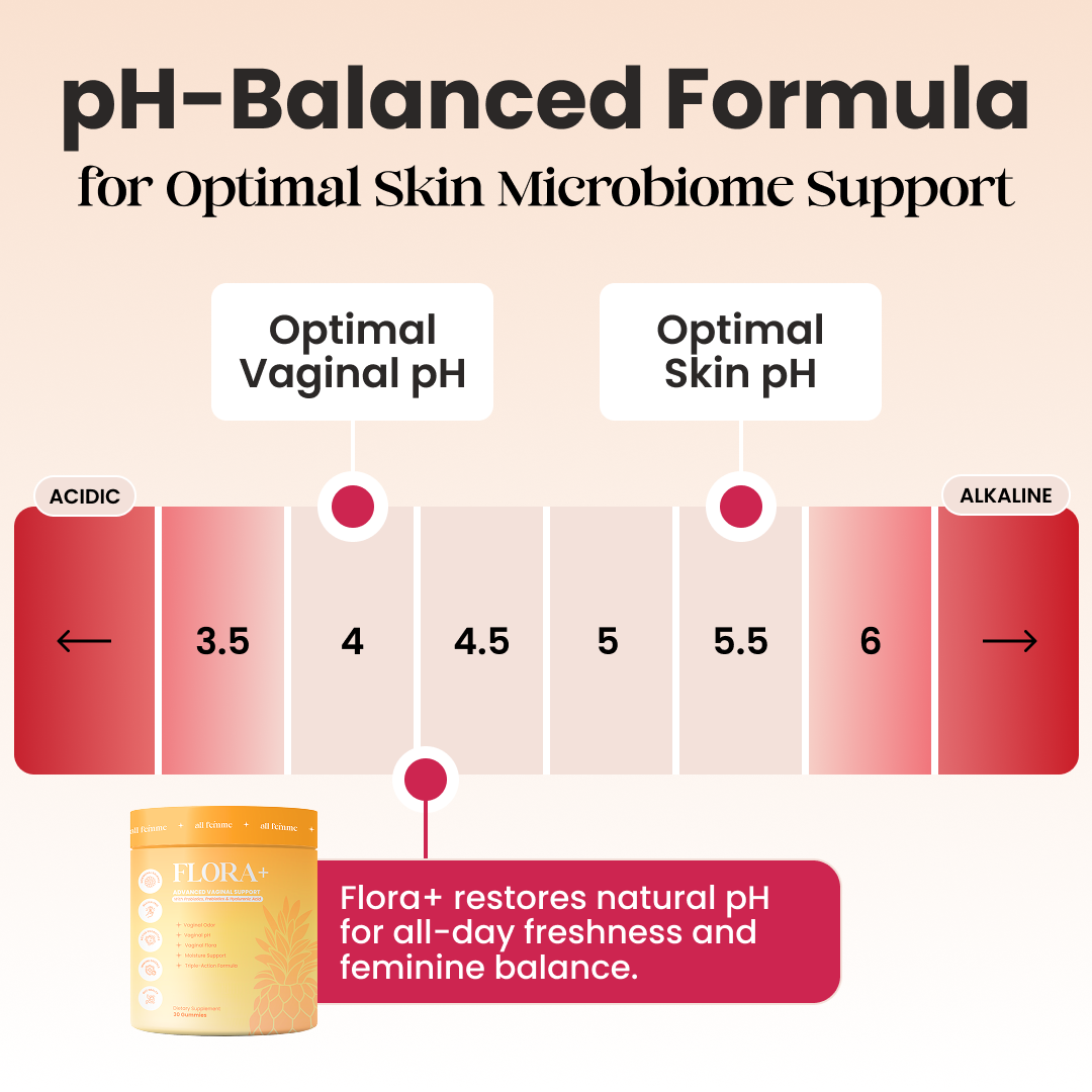 Flora+ works internally through two clinically supported mechanisms: 1. Hyaluronic Acid Rehydration Replenishes moisture within vaginal tissue, supporting natural lubrication and comfort. 2. Targeted Vaginal Probiotics Actively rebalance the vaginal microbiome and restore optimal pH (3.8–4.5), eliminating odor at the source.
