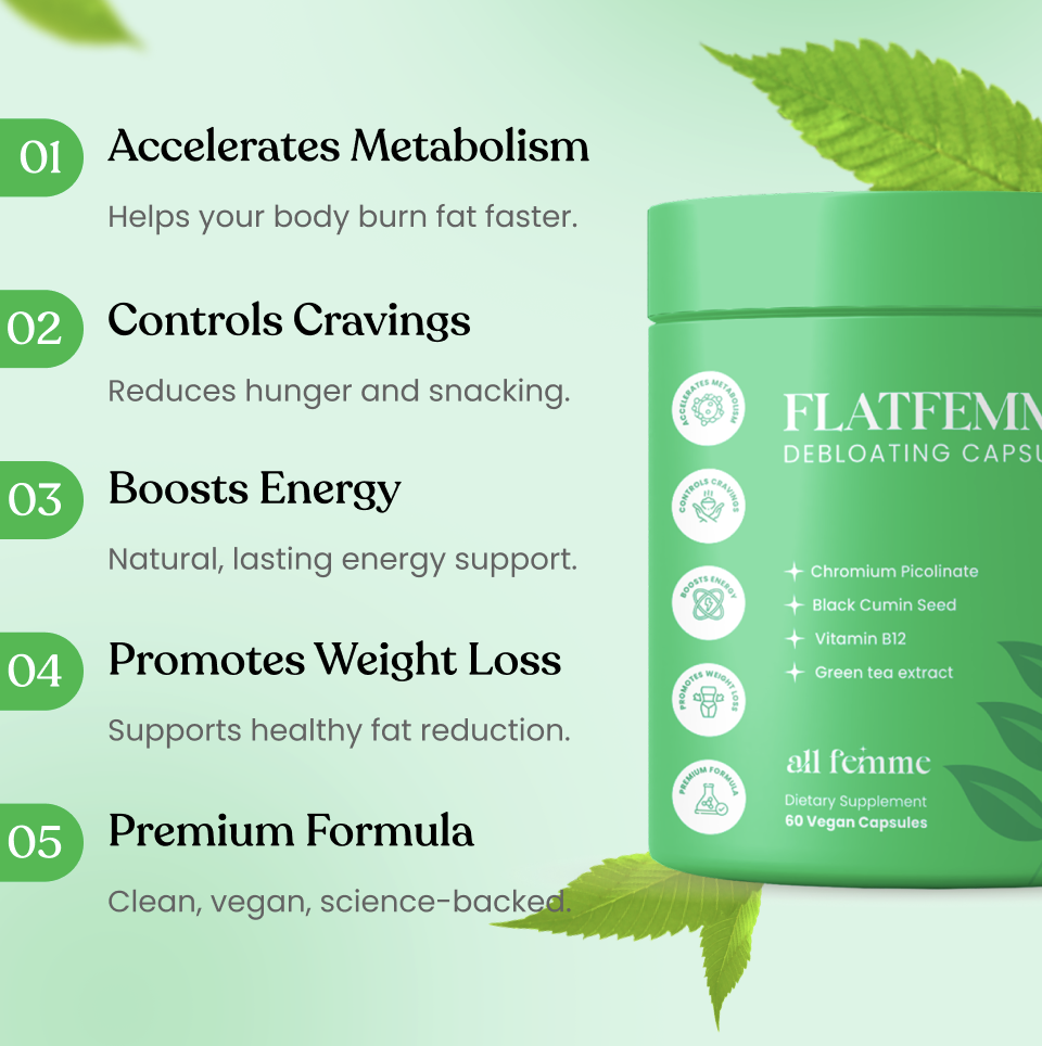 FlatFemme combines gentle thermogenic ingredients to support fat burning with digestion-supportive herbs that help reduce bloating and water retention without harsh stimulants or crash diets.